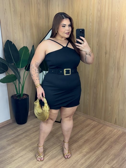 Macaquinho ALCINHA-LUXO, saia fake, acompanha cinto, fabricado na malha crepe, TAM G1 plus (48/52)